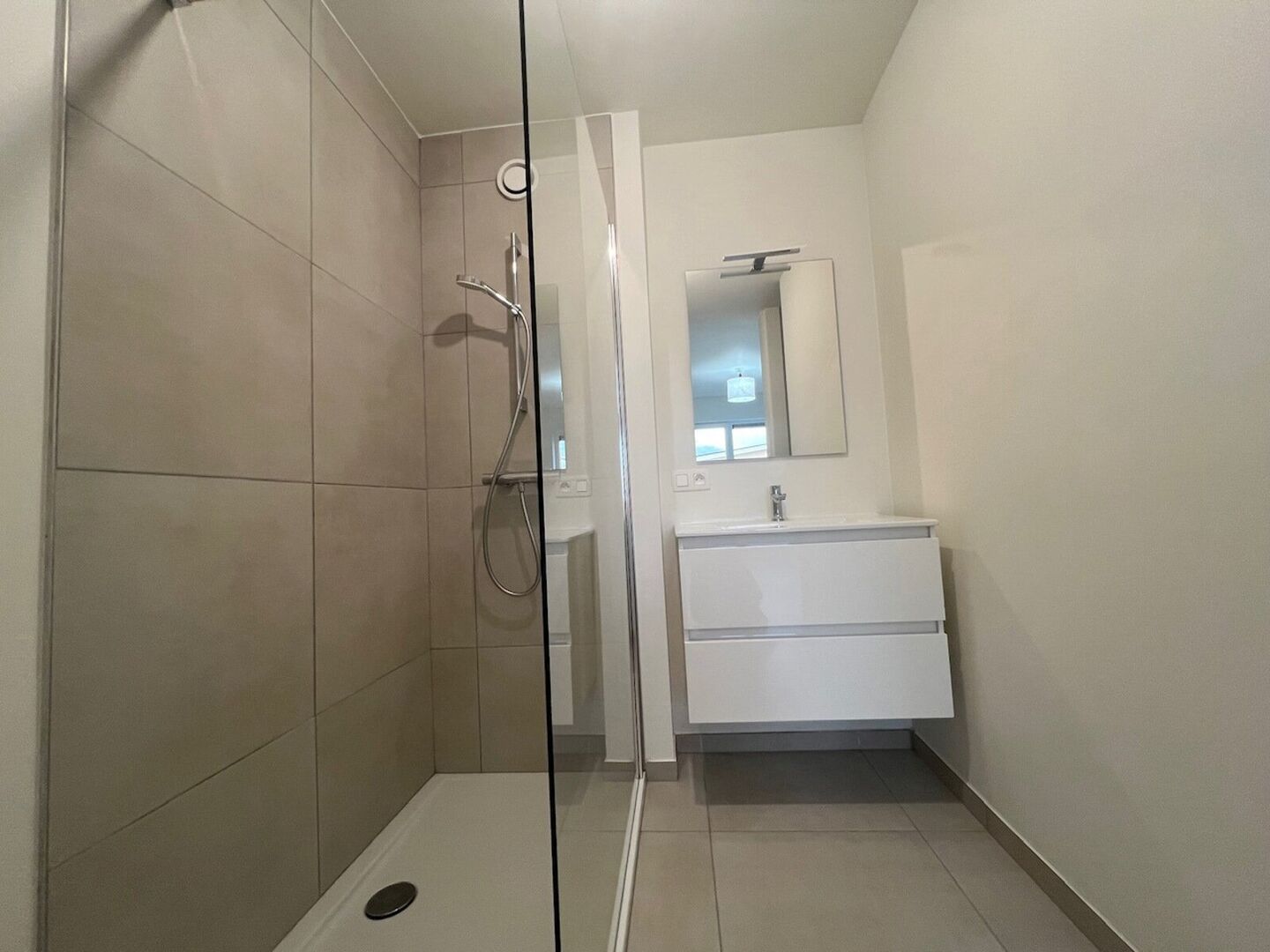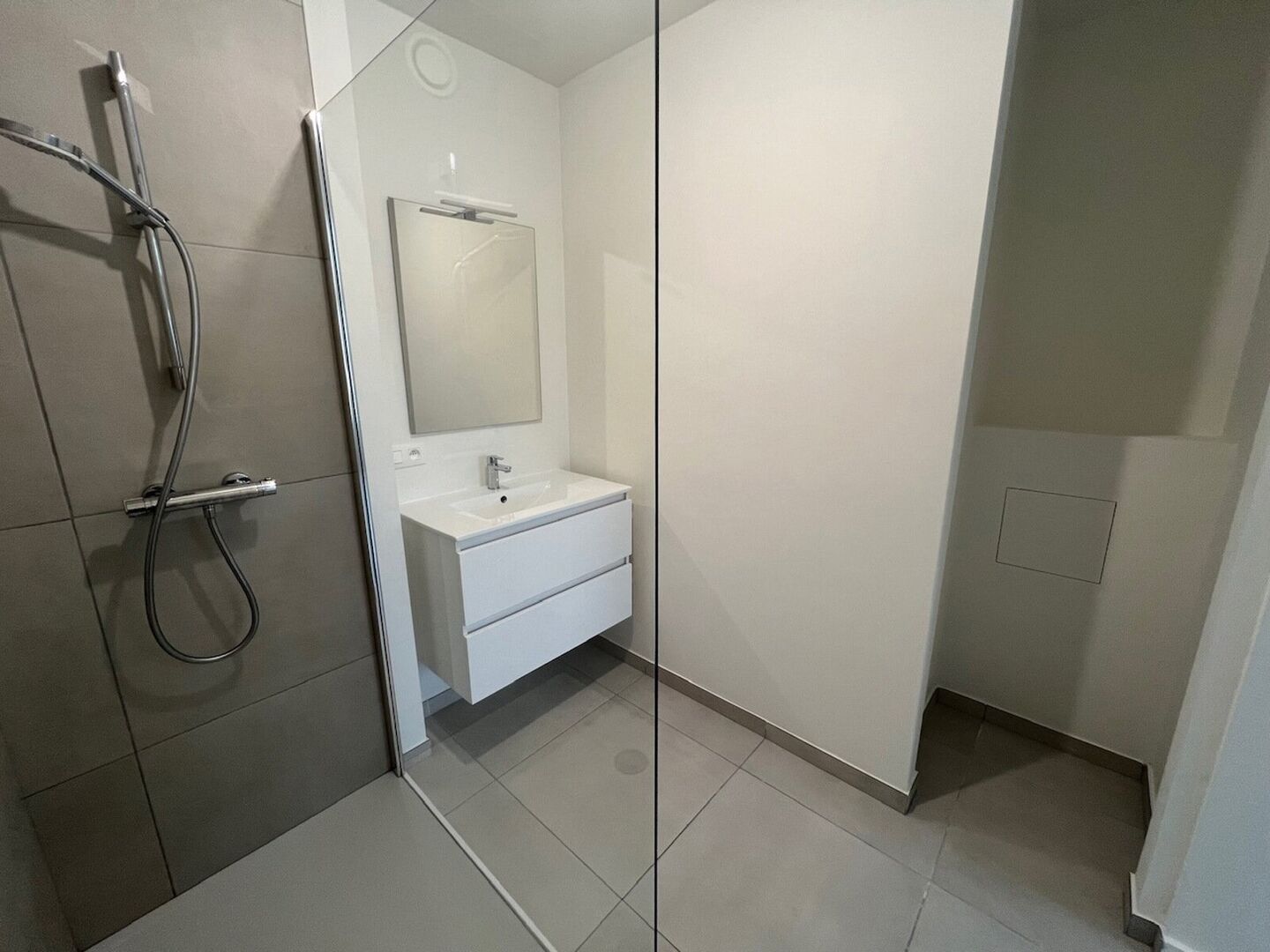 Indeling: inkomhal; apart toilet; lichtrijke woonkamer, met toegang tot overdekt terras; geïnstalleerde keuken voorzien van de nodige toestellen; berging met aansluiting voor WM/DK; slaapkamer; ensuite badkamer bevat lavabo en inloopdouche.