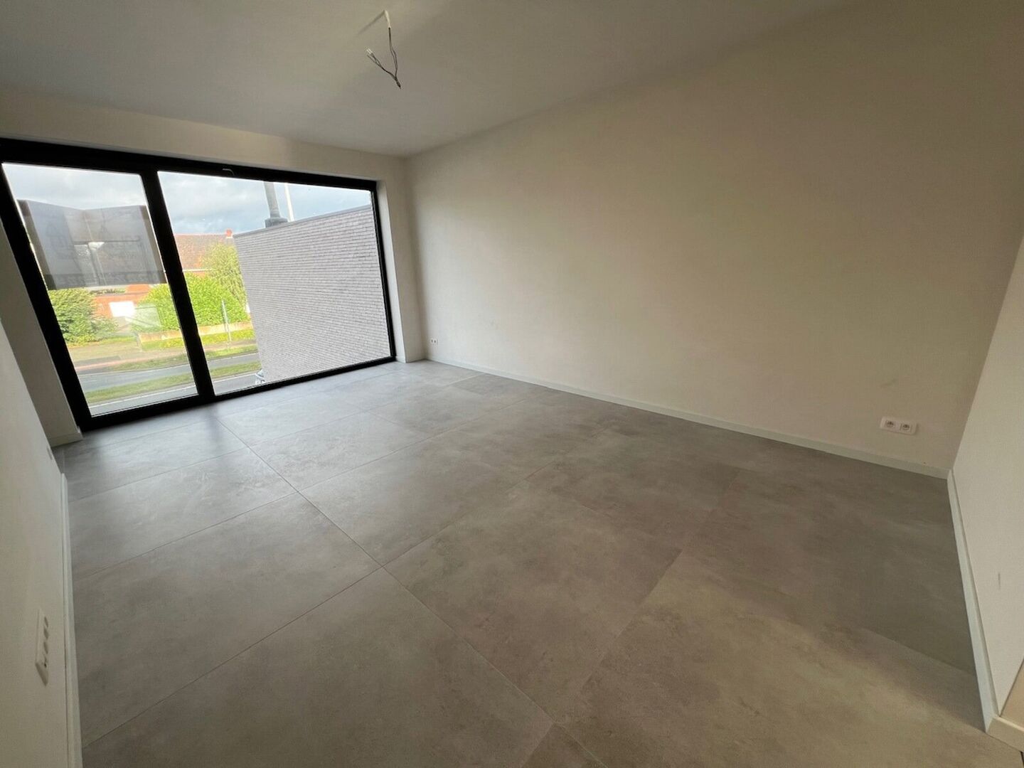 Nieuwbouw afgewerkte duplex (98m²) met aparte ingang, 2 slaapkamers, achterliggend terras (15m²) en bovengrondse parkeerplaats.
