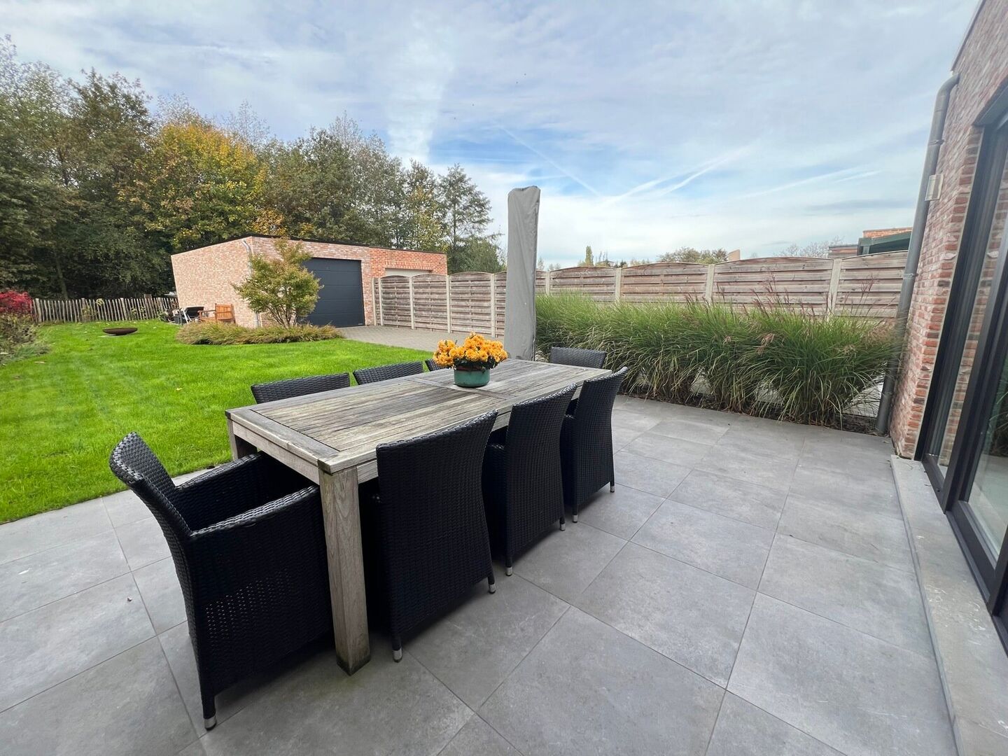 Vooraan bevindt zich een oprit met toegangspoort; achteraan een aangelegd terras, gezellige tuin en afgesloten garagebox.