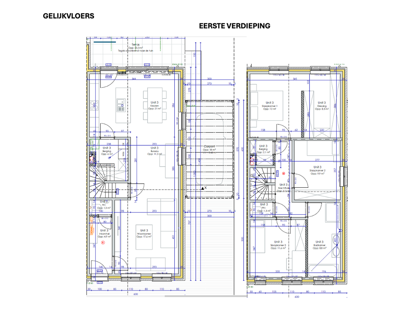 Eerste verdieping: 3 slaapkamers, badkamer met inloopdouche, dubbele lavabo en bad, berging